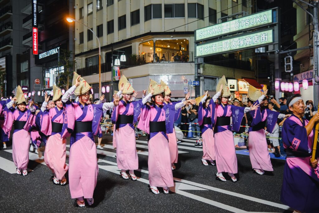 Surnommé « l’Awa Odori du mont Fuji », ce festival offre une belle ambiance locale avec vue sur Fujisan, mêlant danses traditionnelles et marché estival. - 3e samedi d’août : Otsuka Awa Odori à Tokyo